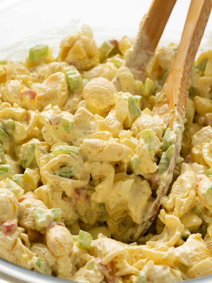 3. Add the pasta, eggs, celery, onion, pimentos and bell pepper and stir to combine. Season to taste with salt and pepper and chill until ready to serve. Enjoy!