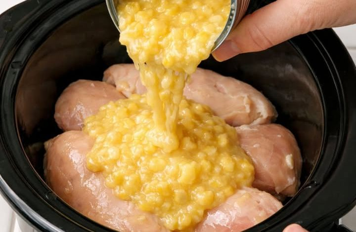 Place the uncooked chicken breasts in a single layer at the bottom of a 5–6 quart slow cooker. Pour the cream-style corn on top, then add the chicken broth along with the salt and pepper.