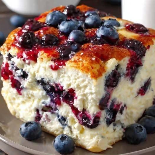 Assemble:Â Pour the batter into the prepared baking dish. Scatter the remaining blueberries across the top, pressing them slightly into the surface.