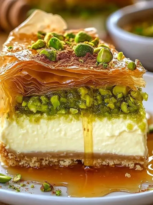 This decadent dessert fuses the classic New York-style cheesecake with the flavors of Middle Eastern baklava. A crisp phyllo and