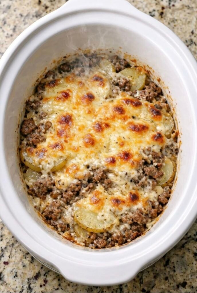 Prep Time: 15minutes minutes Cook Time: 1hour hour 15minutes minutes Servings: 6 Ingredients 1.5 pounds ground beef 1 yellow onion finely diced 4 pounds russet potatoes peeled and sliced into 1/4-inch pieces 2 cups grated cheddar