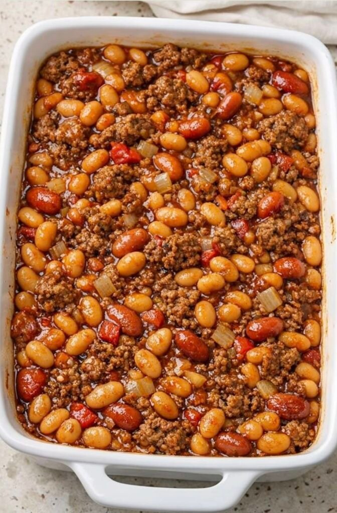 This Cowboy Beans and Beef Casserole is a hearty, flavor-packed comfort dish loaded with seasoned ground beef, smoky bacon, tender