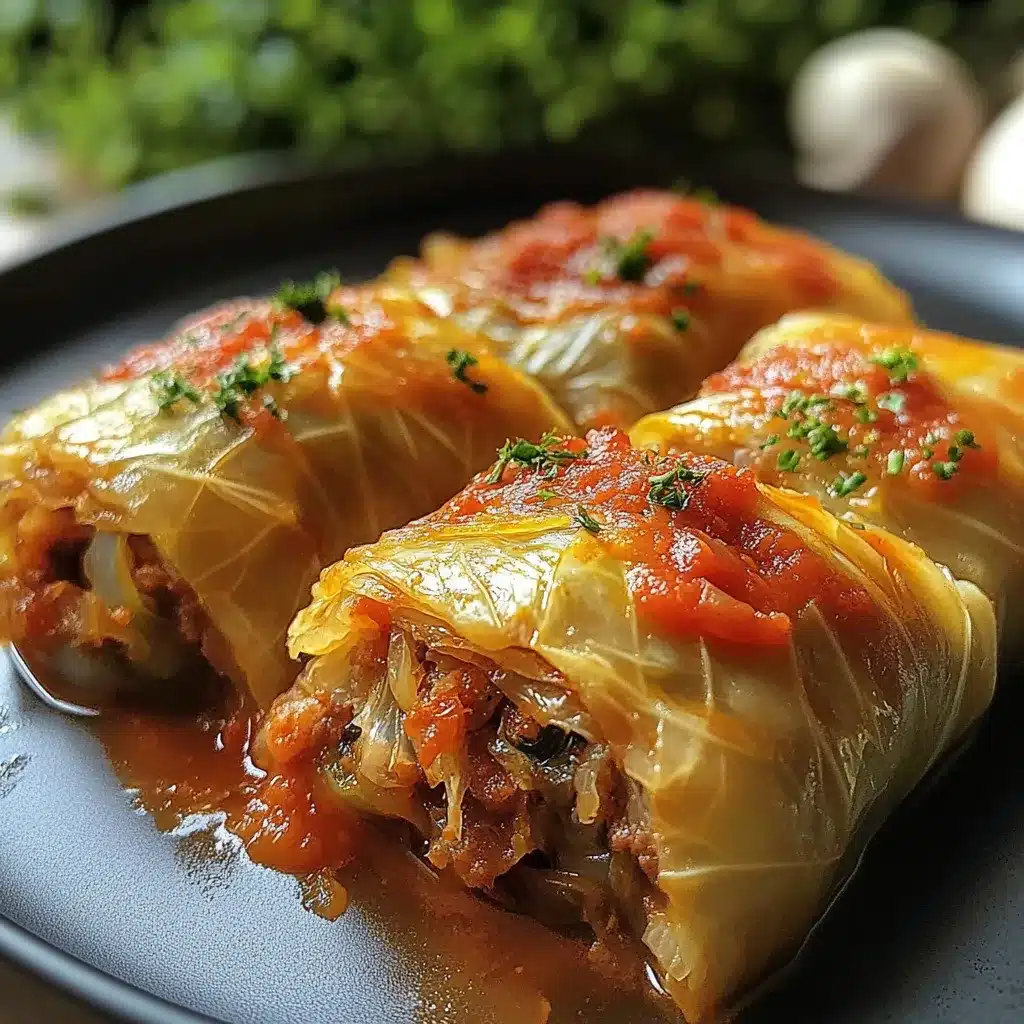 Total Time: 1 hour 10 minutes  Yield: 8 rolls  Diet: Low Fat Cabbage rolls stuffed with meat, rice, and vegetables, topped with homemade