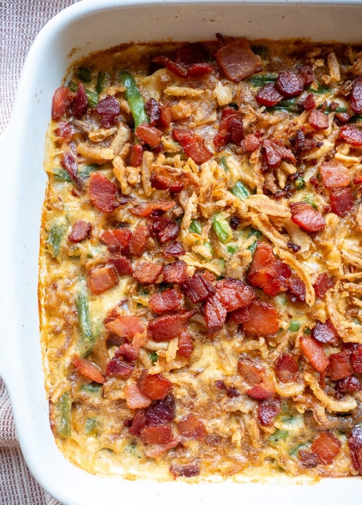 - Arrange green beans in prepared baking dish, then pour sauce over them and stir to combine. Bake 25 minutes.