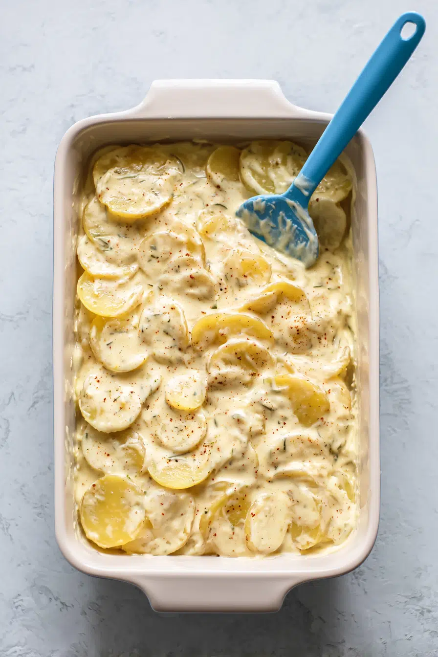 Layer thin slices of onions, mushrooms, or spinach between the potatoes for added texture and flavor.