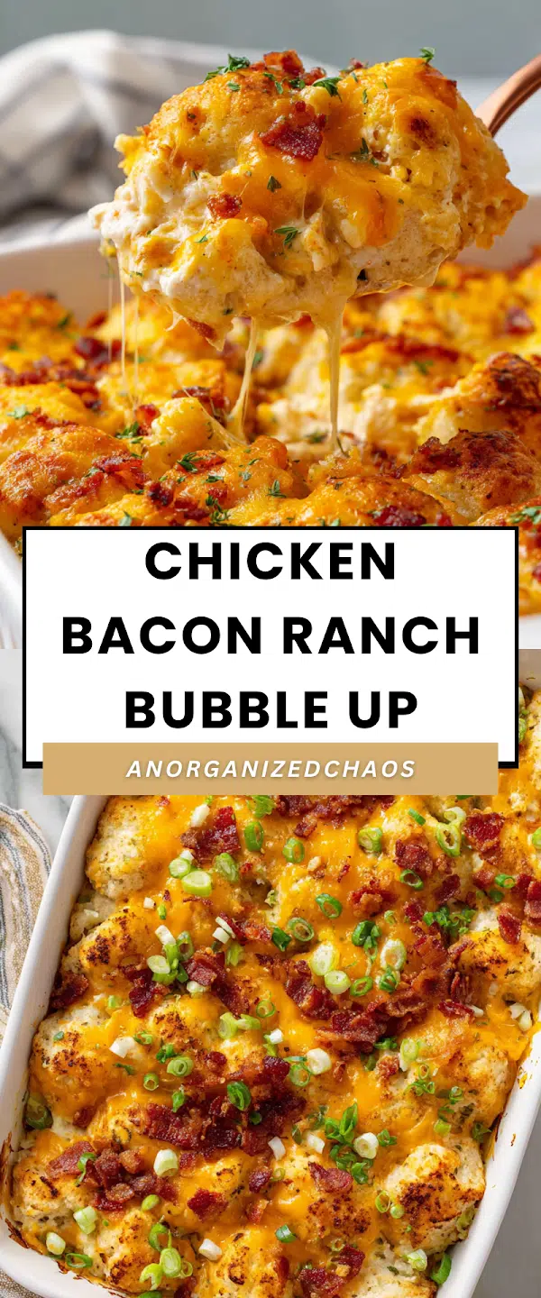 Chicken Bacon Ranch Bubble Up is a baked chicken casserole made with biscuit dough pieces that “bubble up” while baking, combined with ranch-seasoned chicken, bacon, and cheese.