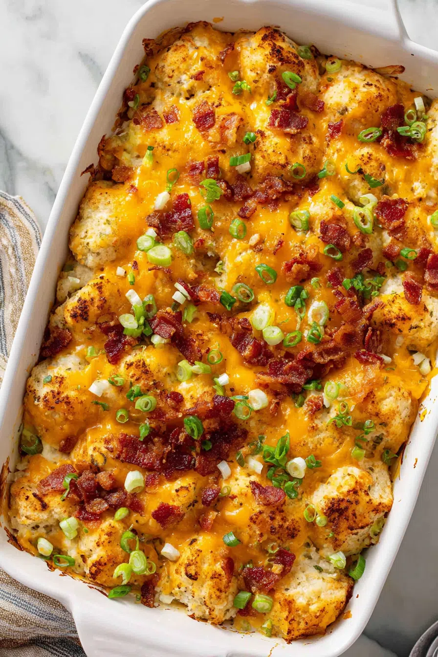 It’s the recipe I make when the day has been long, the laundry is still waiting, and I want something that feels indulgent but is secretly so easy. It’s creamy ranch-coated chicken, crispy bacon, fluffy biscuit pieces, and melty cheese baked together into one irresistible, golden dish.