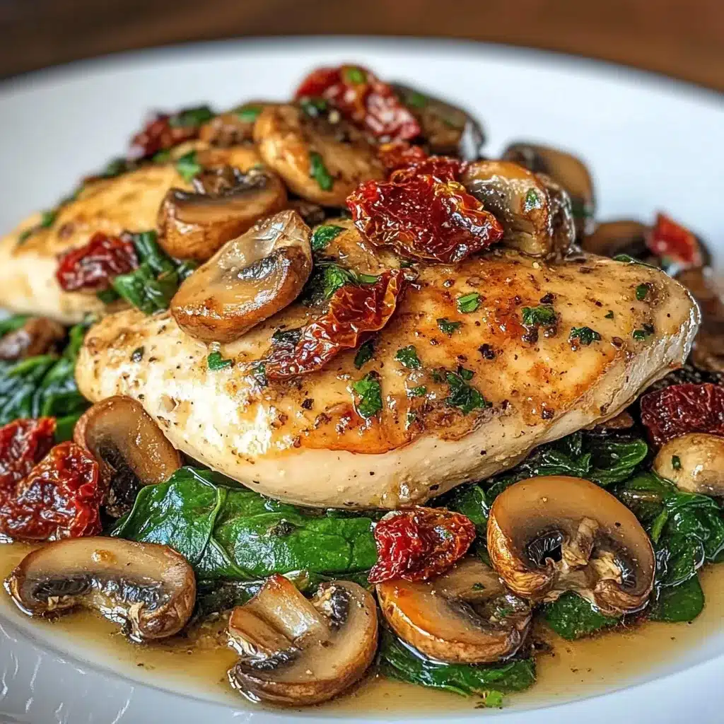 A creamy and comforting chicken recipe with sautéed mushrooms, fresh spinach and sun-dried tomatoes, ideal for a complete and tasty meal.