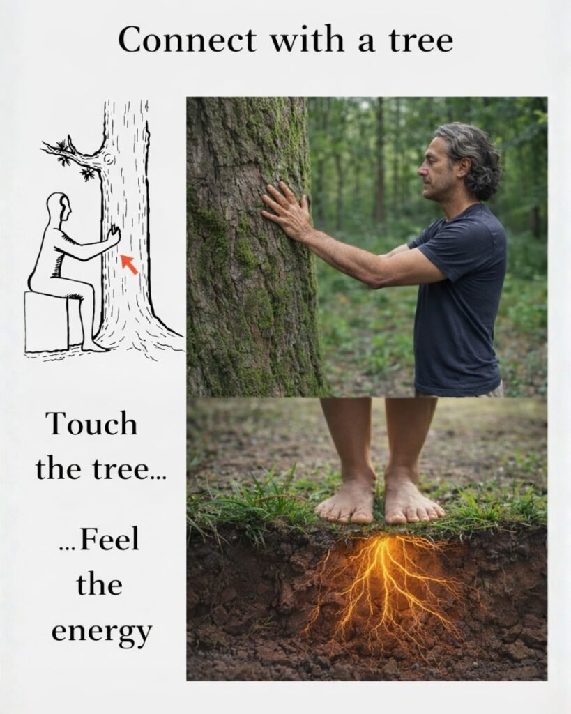 Stand barefoot on the soil, grass, or moss near the tree’s roots. This direct skin-to-Earth contact is central to earthing. - Place your hands on the tree