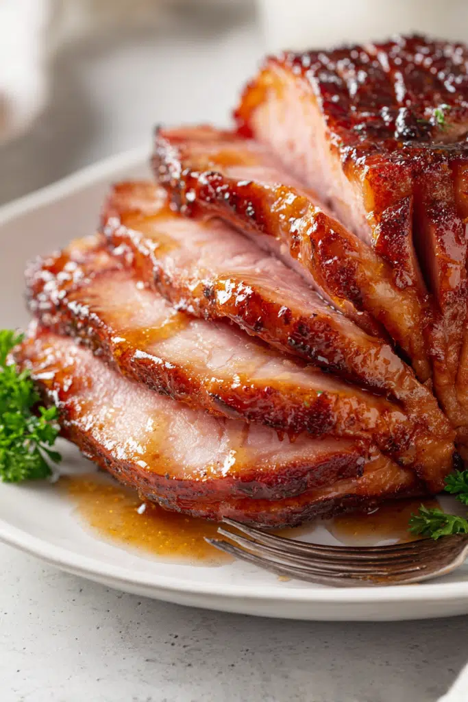 Every 20–30 minutes, brush additional glaze over the ham for a shiny, caramelized finish.