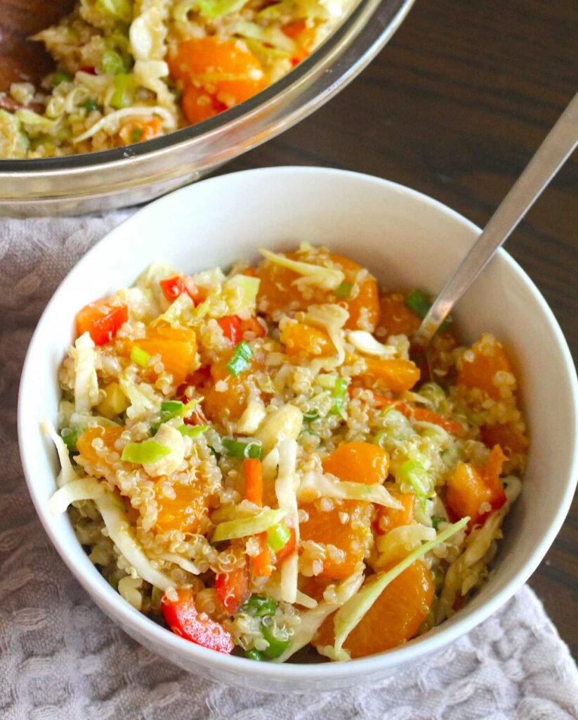 - Combine cooled quinoa, cole slaw mix (reserve dressing package for another use if one is included), bell pepper, orange slices, green onions, cashews, and almonds.