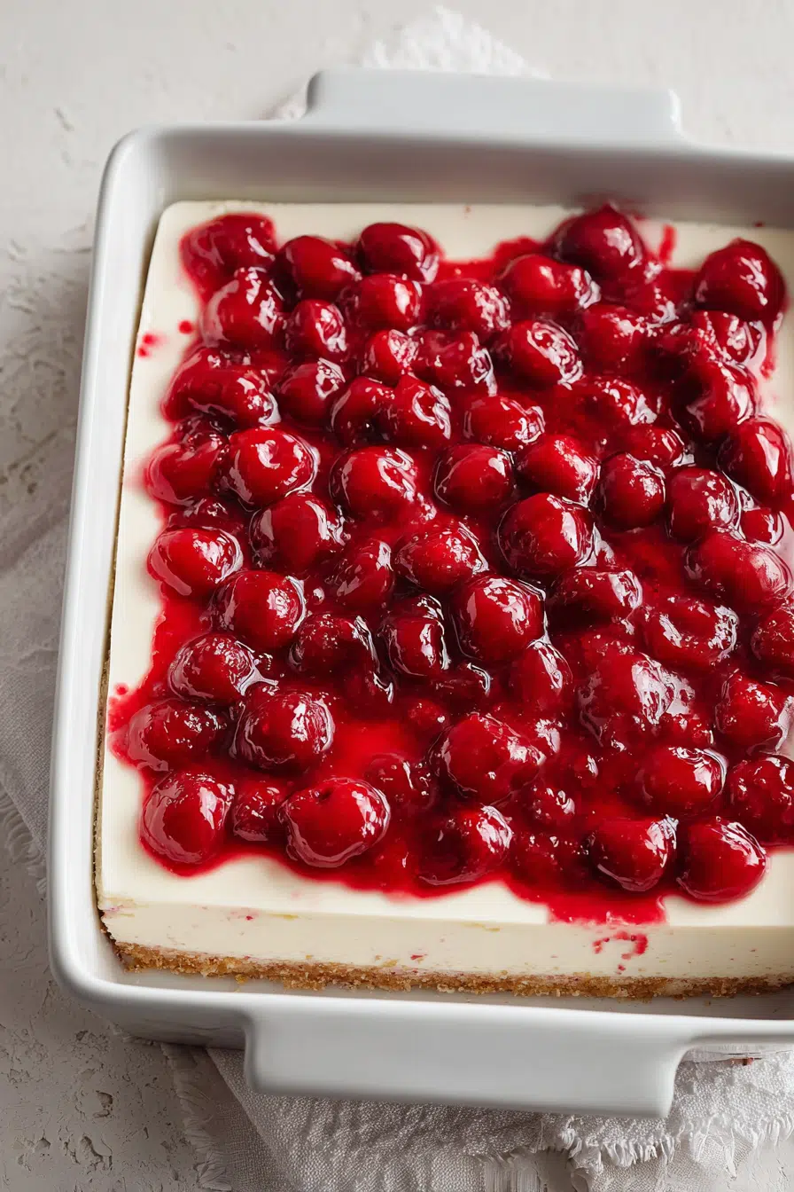 Spread the cherry pie filling evenly over the fully set cheesecake. This keeps the topping vibrant and prevents bleeding into the filling.