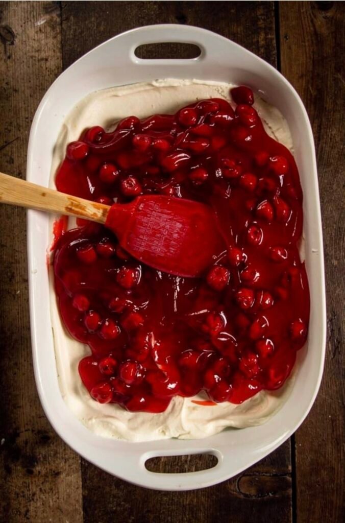That classic cherry topping delivers just the right balance of sweetness and brightness, making this dessert feel familiar and comforting for all ages.