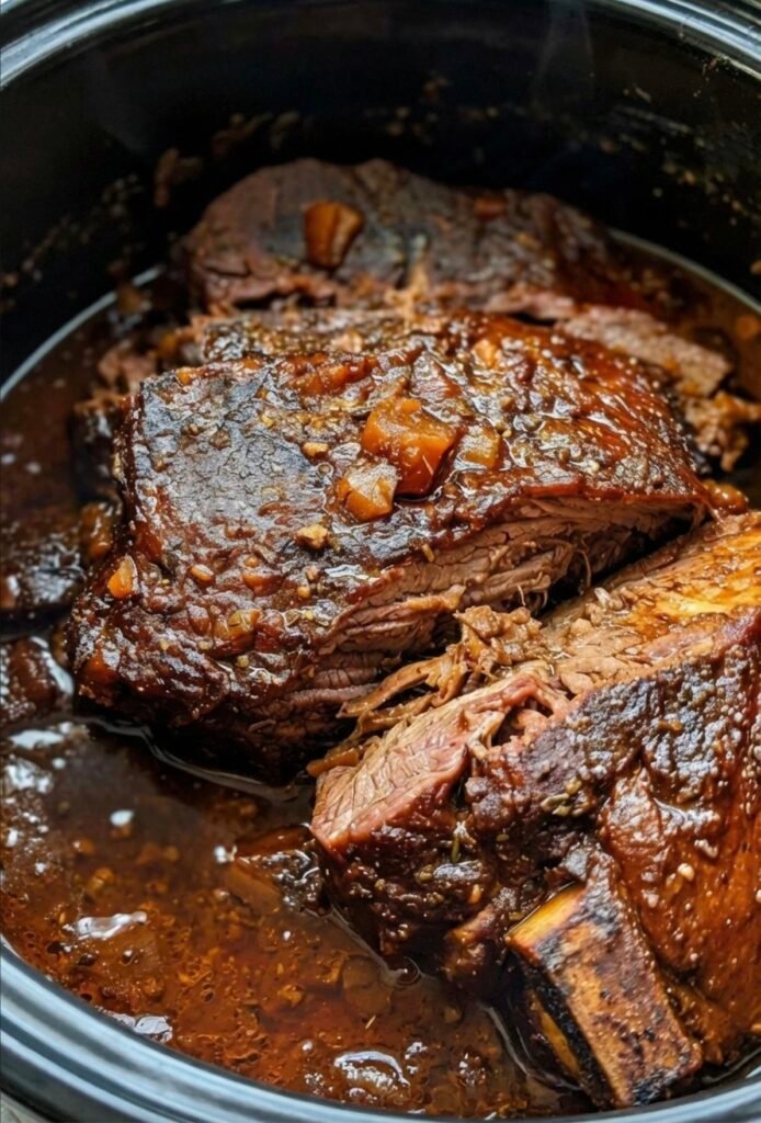 • Heat olive oil in a large skillet over medium-high heat. Sear the brisket for 2–3 minutes per side until nicely browned. Transfer to a slow cooker.