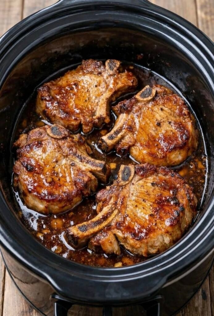 Place pork chops in the slow cooker.