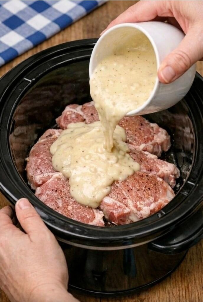 Heat olive oil in a skillet over medium-high heat. Season pork chops lightly with salt and pepper, then sear for 2–3 minutes per side until golden. Transfer to the slow cooker.
