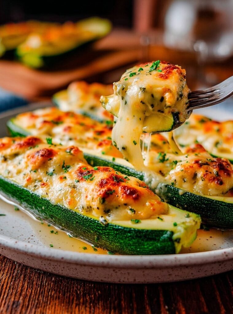 Place the stuffed zucchini in a baking dish and top generously with grated cheese.