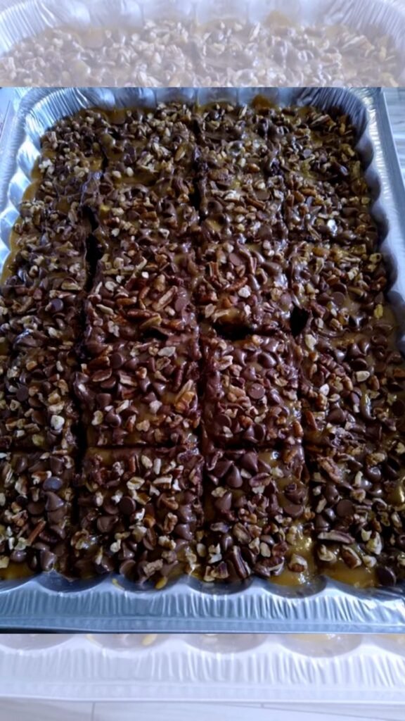 Sprinkle the chocolate chips and pecans over the caramel topping and cake